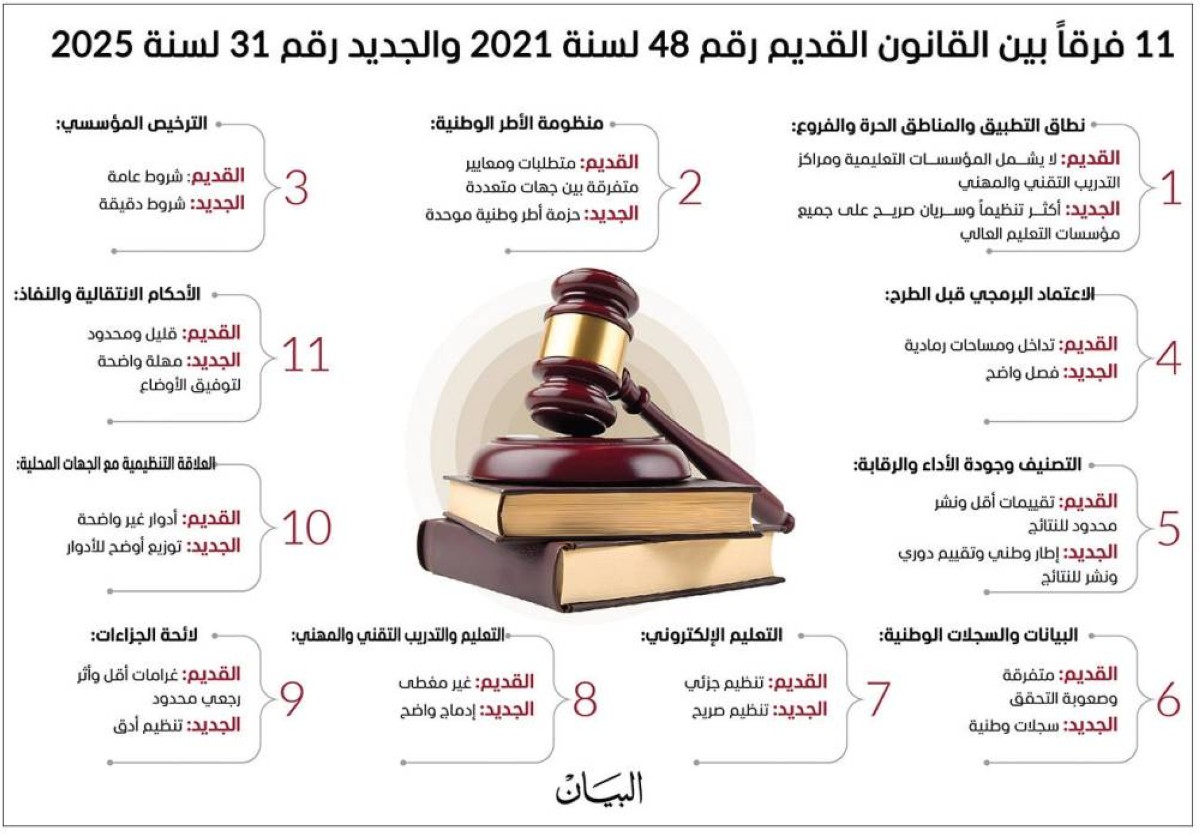 ومن منطلق دعم الاستقرار المؤسسي، نص القانون الجديد على منح الجامعات والمؤسسات التعليمية مهلة زمنية لتوفيق أوضاعها بما يتوافق مع أحكامه، بما يعكس نهجاً تشاركياً يوازن بين التطوير والواقعية في التطبيق.