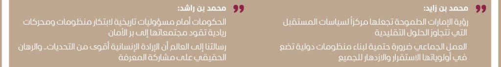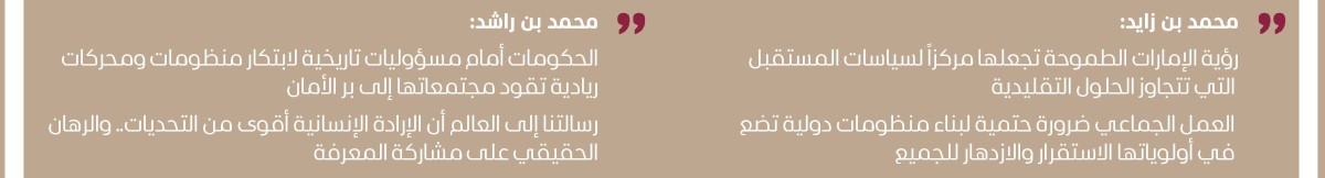وأضاف سموه: «نؤمن في الإمارات أن ريادة المستقبل لمن يقود التغيير وليس لمن ينتظره، وأن استشراف القادم هو استثمار في التقدم الحضاري والازدهار المستدام.. حكومات العالم اليوم أمام مسؤوليات تاريخية لابتكار منظومات ومحركات ريادية تقود مجتمعاتها إلى بر الأمان في ظل التطورات المتلاحقة والتغيرات الكبيرة التي يشهدها العالم على مختلف المستويات».