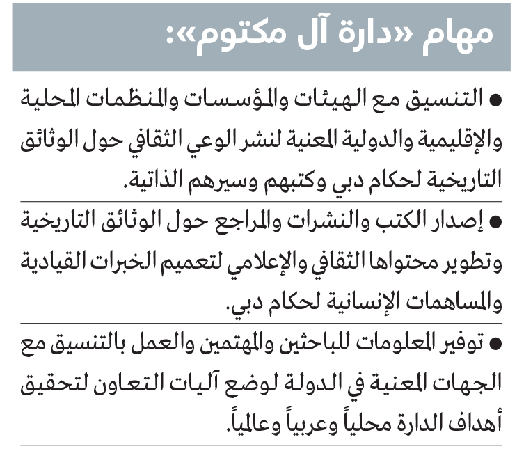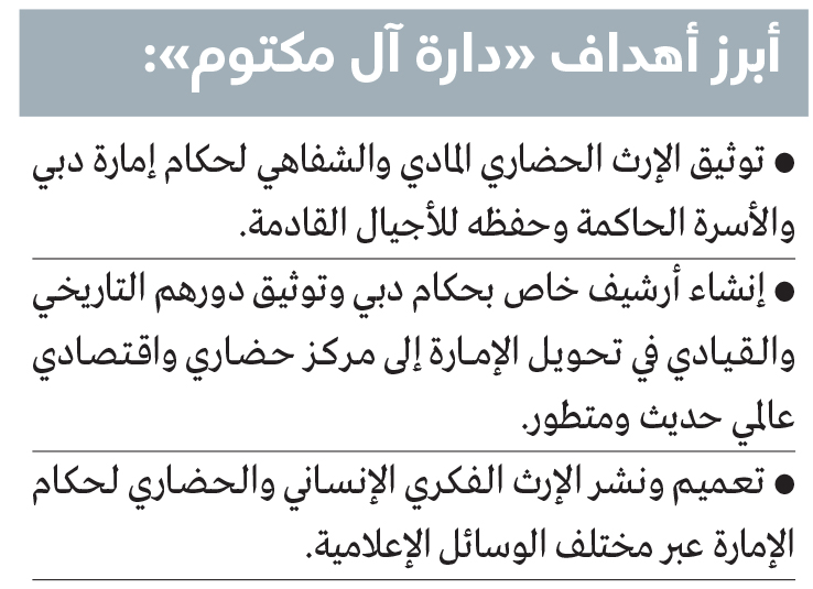 شهد صاحب السموّ الشيخ محمد بن راشد آل مكتوم، نائب رئيس الدولة رئيس مجلس الوزراء حاكم دبي، رعاه الله، يرافقه سموّ الشيخ حمدان بن محمد بن راشد آل مكتوم، ولي عهد دبي نائب رئيس مجلس الوزراء وزير الدفاع رئيس المجلس التنفيذي لإمارة دبي، حفل إطلاق «دارة آل مكتوم»، التي يشرف عليها المكتب التنفيذي لصاحب السموّ الشيخ محمد بن راشد آل مكتوم، وتهدف إلى توثيق الإرث الحضاري المادي والشفاهي لحكام إمارة دبي والأسرة الحاكمة وحفظه للأجيال القادمة، وإنشاء أرشيف خاص بحكام دبي، وسيرهم الذاتية ومقتنياتهم وإسهاماتهم الأدبية والفكرية، وتوثيق دورهم التاريخي والقيادي في تحويل الإمارة إلى مركز حضاري واقتصادي عالمي حديث ومتطور.