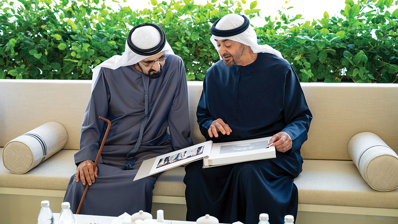 وأهدى صاحب السموّ رئيس الدولة، أخاه صاحب السموّ الشيخ محمد بن راشد آل مكتوم، خلال اللقاء الذي جرى بقصر البحر في أبوظبي، ألبوم صور يحمل توقيع سموّه، ويُوثّق أبرز المحطات الوطنية والمناسبات التي جمعت سموهما في خدمة دولة الإمارات ومسيرة إنجازاتها، وذلك بمناسبة مرور 20 عاماً على تولي سموّه رئاسة الحكومة الاتحادية.