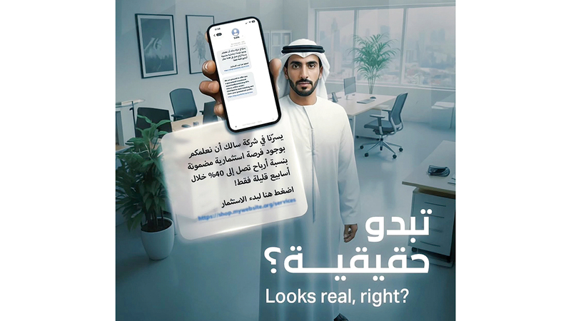 وعرضت «سالك» نموذجاً توضيحياً لإحدى الرسائل المتداولة التي قد تبدو حقيقية للمتلقي، وتروج لفرصة استثمارية مزعومة بعوائد مرتفعة خلال فترة زمنية قصيرة، وتستخدم لغة احترافية وتصميماً يوحي بالمصداقية، وجاء بنص الرسالة: «يسرنا في شركة سالك أن نعلمكم بوجود فرصة استثمارية مضمونة بنسبة أرباح تصل إلى 40% خلال أسابيع قليلة فقط! اضغط هنا لبدء الاستثمار».
