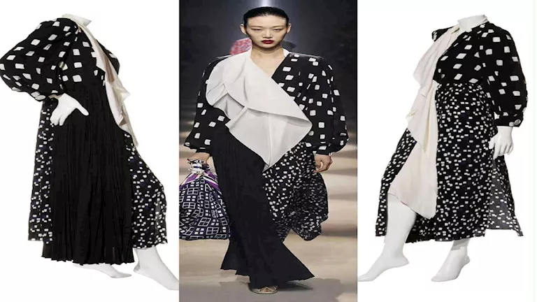 الفستان مصنوع من الحرير الطبيعي، بنقشة polka dots بالأبيض والأسود على النصف الأيسر، بينما يهيمن على النصف الأيمن اللون الأبيض النقي مع طبقات ruffles غير متماثلة تنساب بانسيابية لافتة، مانحة الإطلالة حركة ديناميكية.