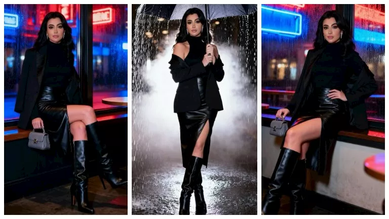 ظهرت ميرهان مرتدية إطلالة جريئة وأنيقة، وحملت في يدها مظلة تحت الأمطار .