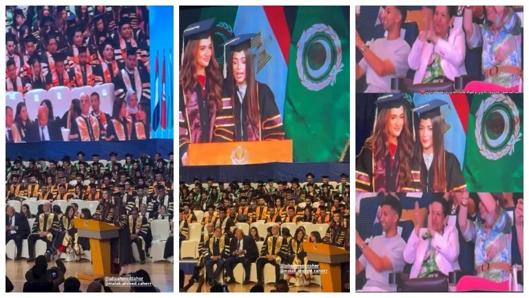 ونشرت ملك صورًا من حفل التخرج عبر خاصية ‘الستوري’ على حسابها بموقع إنستجرام، وظهرت في الصور مع شقيقتها ليلى زاهر، بحضور زوجها المنتج هشام جمال، ووالدها أحمد زاهر ووالدتها، وسط أجواء مبهجة.