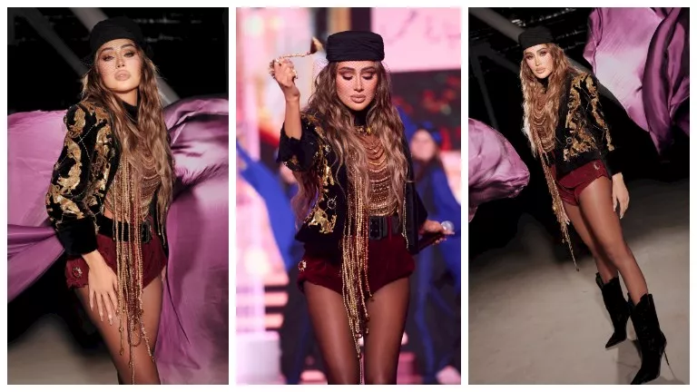 وظهرت مايا دياب بإطلالة جريئة ولافتة كعادتها، مرتدية، جاكيت أسود مطرز بخطوط ذهبية وشورت بنفس اللون.