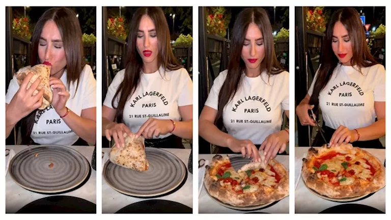 وكتبت، تعليقًا على الفيديو: “إتيكيت أكل البيتزا في إيطاليا، ماتسمعوش كلام أمينه شلبايه” .