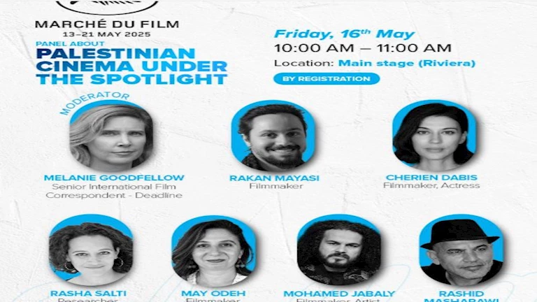 تحت عنوان “السينما الفلسطينية تحت المجهر”، يسلط مركز السينما العربية بالتعاون مع مؤسسة الفيلم الفلسطيني وسوق الأفلام بمهرجان كان السينمائي، الضوء على السينما الفلسطينية من خلال ندوة يحضرها مجموعة من الأسماء البارزة في صناعة السينما الفلسطينية وذلك يوم الجمعة 16 مايو من الساعة 10 حتى 11 صباحًا على المسرح الرئيسي.
