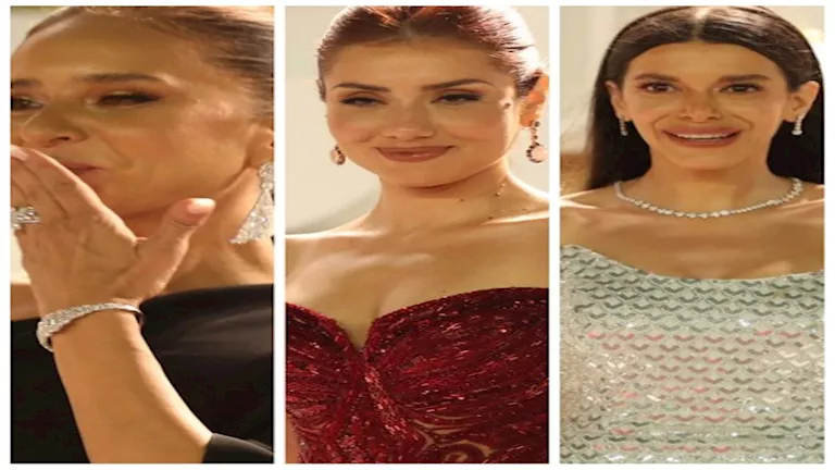 تألقت الفنانة مايا دياب بفستان جريء باللون الذهبي شفاف من الجانبين، واعتمدت مكياجا ترابيا، وزينت إطلالتها بمجوهرات ماسية مكونة من كوليه وخاتم.