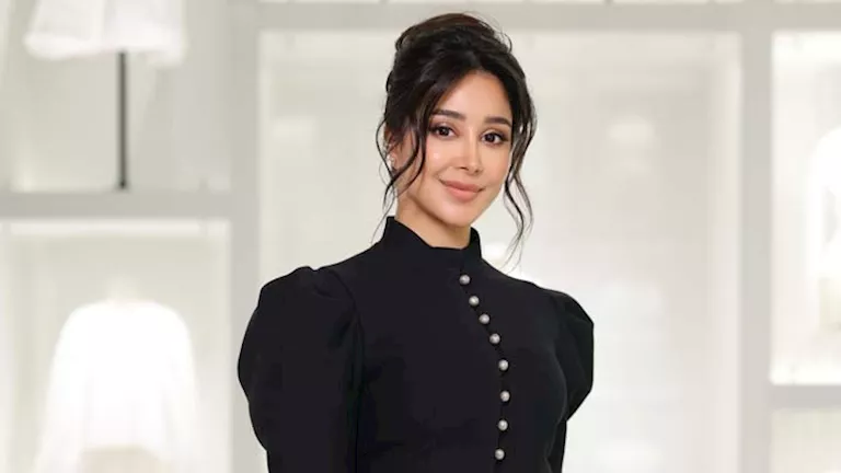 ظهرت أسيل مرتدية فستان طويل مزيج من اللونين الأسود والرصاصي بقصة انسيابية على الجسم، ومزين بتطريزات لامعة.