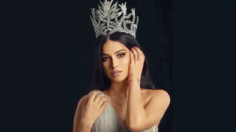 ارتدت أية فستان طويل باللون الأبيض بقصة “الكب” مزينا بتطريزات باللون الفضي، من تصميم “KIYAT”.