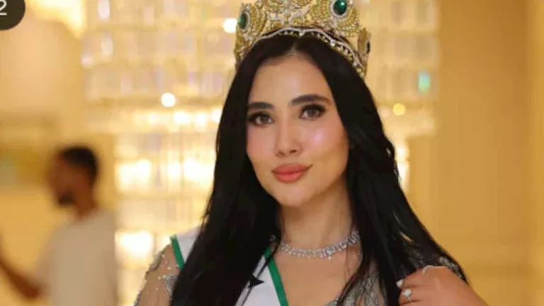 أكملت بسنت الإطلالة بتاج ملكي فاخر مرصع بالأحجار الخضراء والذهبية، وحزام الشريط الأخضر والأبيض الذي يحمل لقبها الرسمي.