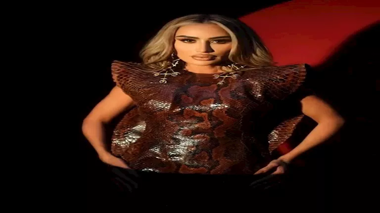 وارتدت فستاناً طويلاً بفتحة جانبية جريئة، وتصميم “أوف شولدر” يبرز القوام، الفستان مغطى بالكامل بخيوط من الكريستال اللامع والمتداخل بألوان متدرجة تميل إلى الفضي والوردي/الـ “بينك”.