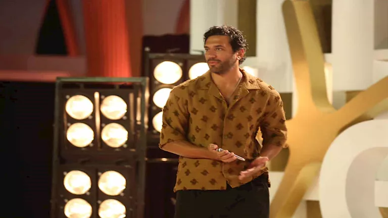 واختار حسن تيشيرت سادة باللون البيج الفاتح أو الكريمي، يتميز بقصة كلاسيكية، ونسق أسفله بنطلون بنقشة كاروهات باللونين البني والأسود، ما أضفى على الإطلالة لمسة من التميز والأناقة.