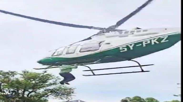 أثار رجل كيني يدعى “أوغا أوبينا” دهشة الحاضرين بعد أن تشبث بأسفل طائرة هليكوبتر أثناء إقلاعها خلال حفل زفاف النجم إيفانز أوتشينغ، المعروف باسم “الأمير إندا”، بحضور العديد من الشخصيات العامة.