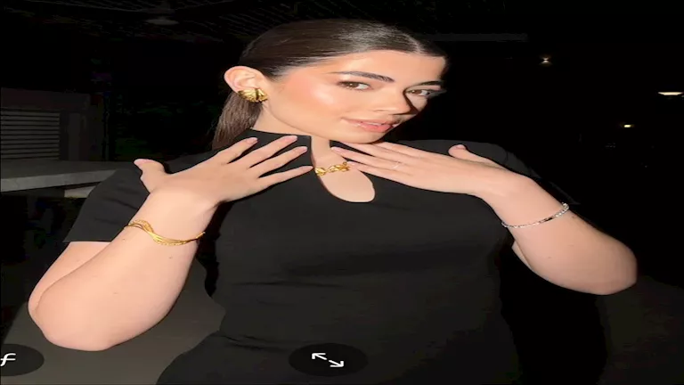 وأطلت ليلى مرتدية فستان بلون النيود أو البيج الفاتح جدًا، مغطى بالكامل بتفاصيل براقة تجمع بين اللونين الذهبي والفضي، الفستان بقصة محتشمة نسبياً.