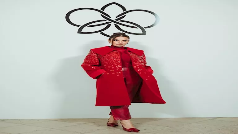 ارتدت معطفا أحمر طويلا، مزينا بتطريزات ولمسات لامعة على الجزء العلوي.