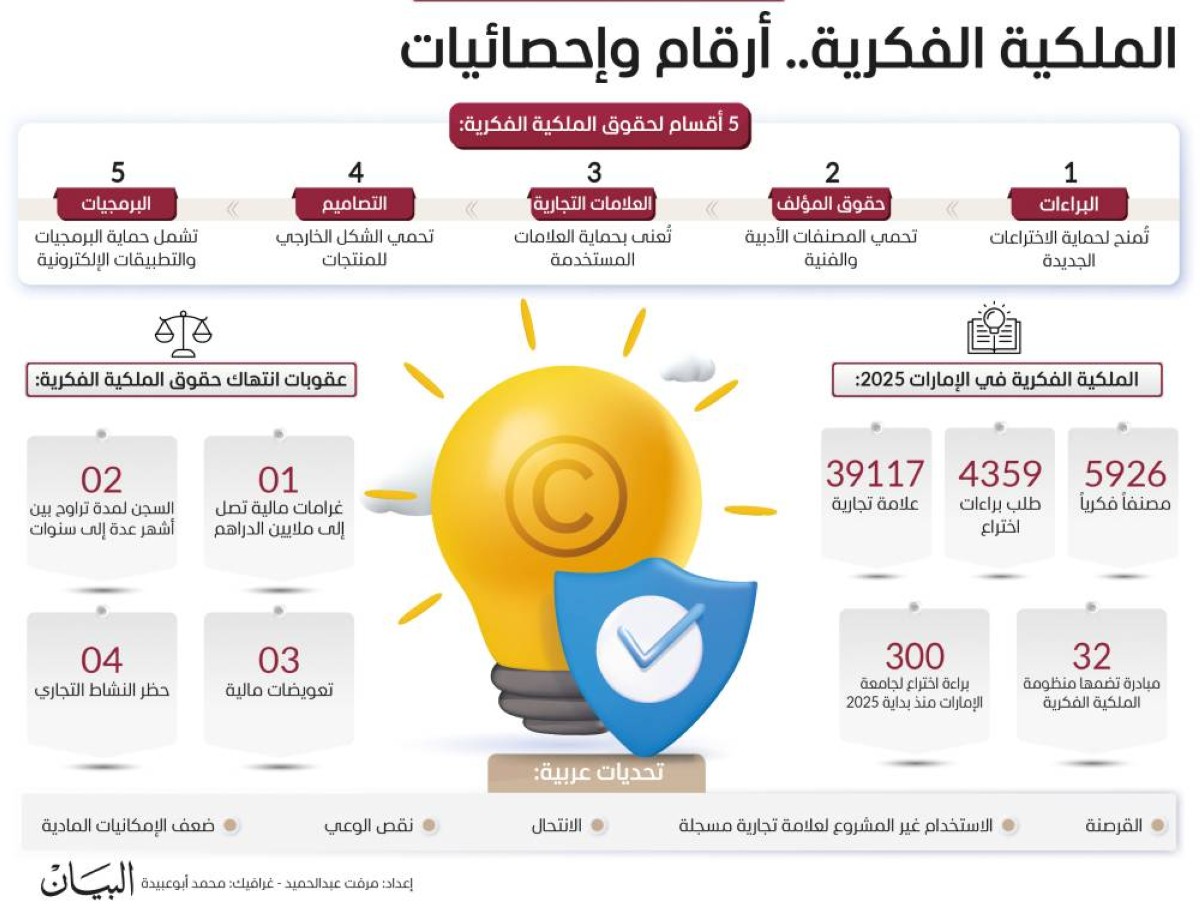 وأكد حرص المشرع الإماراتي على توفير حماية تشريعية متكاملة للملكية الفكرية، من خلال مجموعة من القوانين الاتحادية، من أهمها: قانون حق المؤلف والحقوق المجاورة، الذي يحمي المصنفات الأدبية والفنية والبرمجيات، قانون العلامات التجارية الذي يجرّم تقليد أو تزوير أو استخدام العلامة دون حق، قانون براءات الاختراع والرسوم والنماذج الصناعية، قانون مكافحة جرائم تقنية المعلومات في ما يتعلق بالاعتداءات الرقمية.