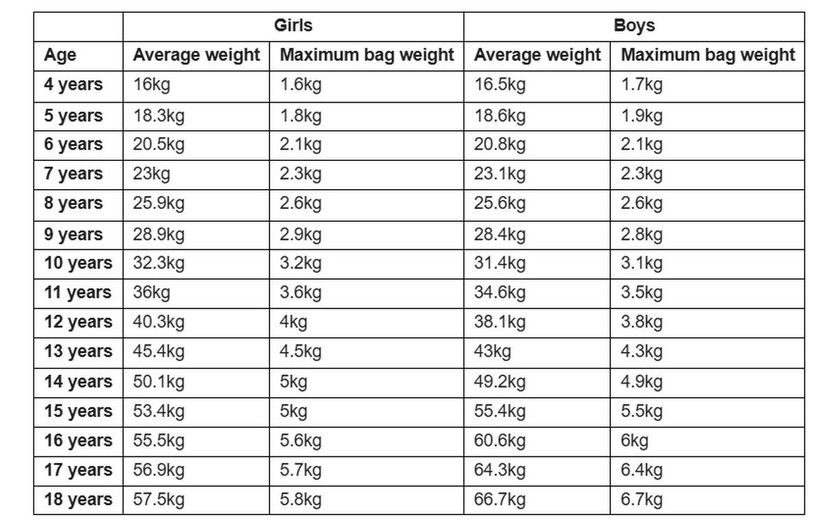 ونظراً لاختلاف معدلات نمو الأطفال وتباين متوسط أوزان الفتيات والفتيان، يؤكد المختصون أن أفضل طريقة لتحديد الوزن الأقصى المسموح به للحقيبة هي حسابه بدقة من خلال معادلة بسيطة؛ وذلك بوزن الطفل ثم ضرب وزنه في 0.1، ليكون الناتج هو الحد الأقصى الآمن لوزن الحقيبة المدرسية.