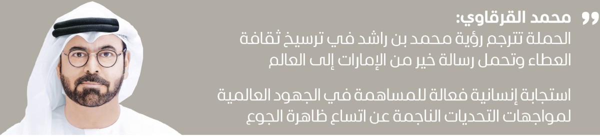 من جانبه، أكد معالي محمد عبد الله القرقاوي الأمين العام لمؤسسة «مبادرات محمد بن راشد آل مكتوم العالمية»، أن حملة «حدّ الحياة» لإنقاذ خمسة ملايين طفل من الجوع في العالم، تترجم رؤية صاحب السمو الشيخ محمد بن راشد آل مكتوم في ترسيخ ثقافة العطاء.