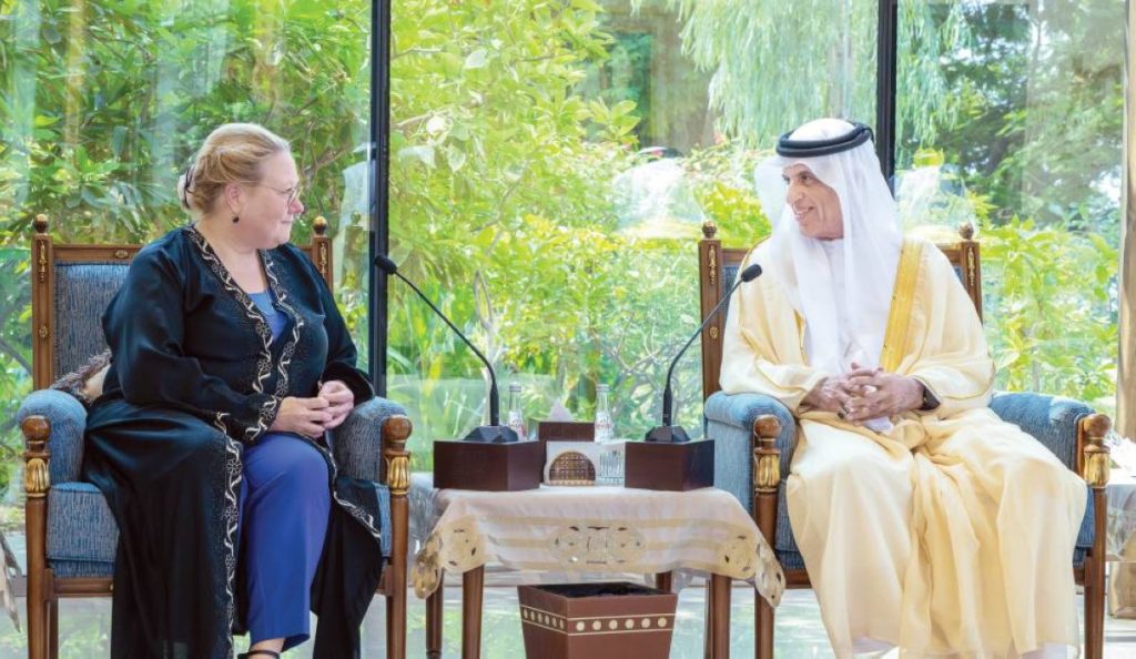 ورحب سموه خلال اللقاء بالسفيرة والوفد المرافق لها، وبحث معها سبل تعزيز العلاقات الثنائية في مختلف المجالات، بما يسهم في دعم مسيرة التنمية ويخدم التطلعات المشتركة نحو مزيد من الازدهار.