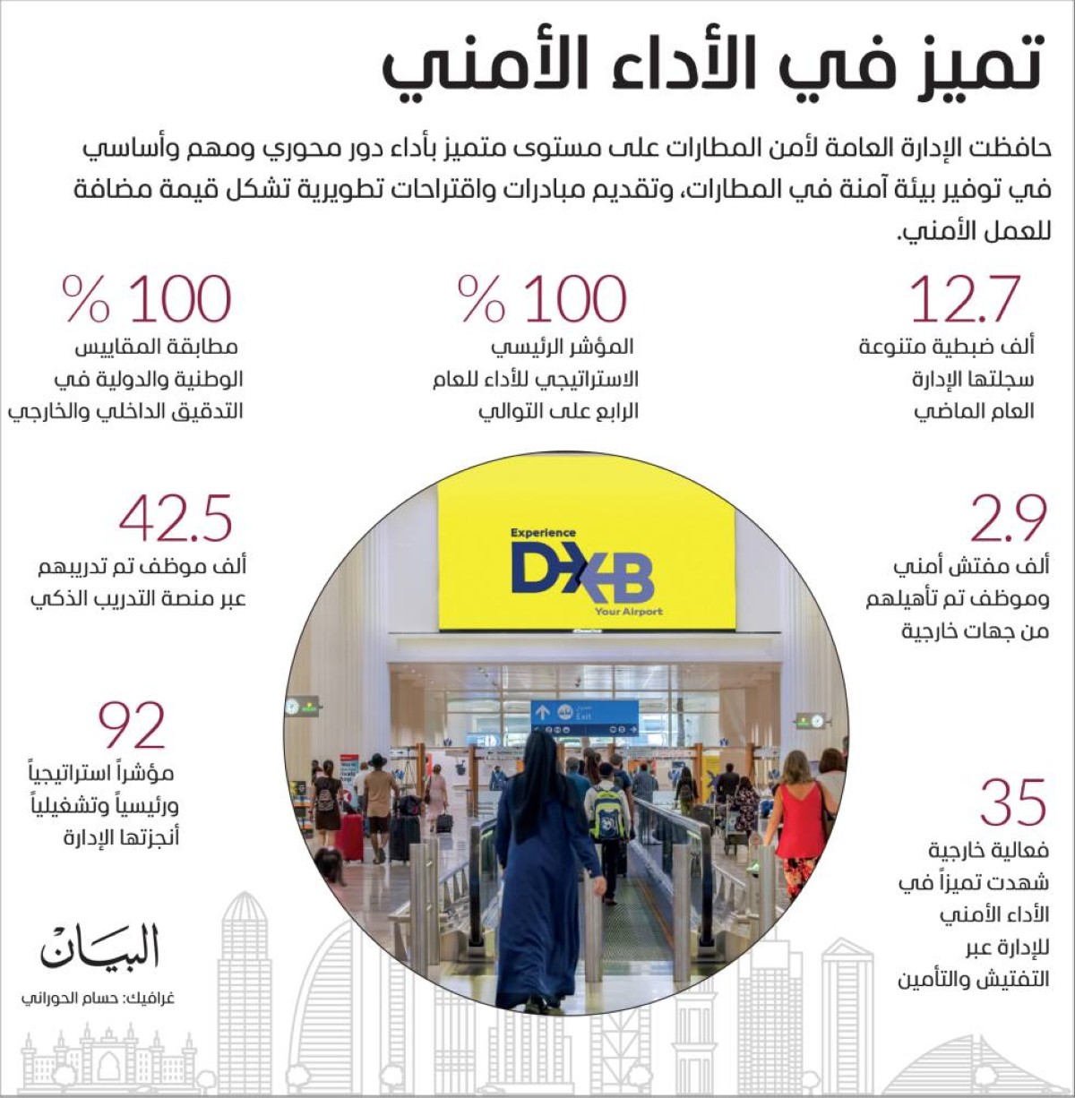 نجحت الإدارة الامة لأمن المطارات في شرطة دبي بالتعاون مع الشركاء من تأمين أكبر مطار في العالم من حيث عدد المسافرين الدوليين للعام الحادي عشر على التوالي، حيث بلغ عدد المسافرين عبر مطار دبي الدولي 92.3 مليون مسافر خلال عام 2024، في أعلى رقم يسجله المطار في تاريخه، إضافة إلى التعامل مع 2.88 مليون طن من الشحن الجوي بكفاءة أمنية عالية، تعكس الجاهزية الميدانية والاحترافية في الأداء، وريادتها العالمية في مجال أمن الطيران المدني.