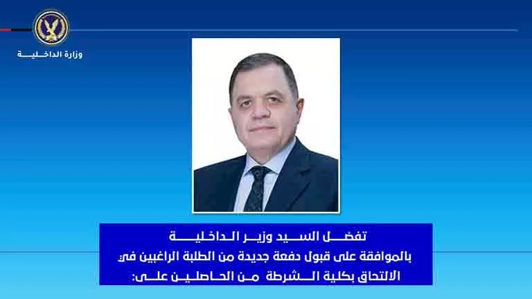 وافق اللواء محمود توفيق، وزير الداخلية، على قبول دفعة جديدة من الطلاب الراغبين في الالتحاق بكلية الشرطة للعام الدراسي 2025 – 2026، من الحاصلين على الثانوية العامة أو ما يعادلها، والثانوية الأزهرية، بحد أدنى مجموع 65% للعام الحالي أو الماضي، بالإضافة إلى الحاصلين على ليسانس الحقوق (ذكور وإناث)، وبكالوريوس التربية الرياضية (إناث فقط) بتقدير أدنى “مقبول”، وكذلك الحاصلين على مؤهلات جامعية تمثل احتياجًا لقطاعات وزارة الداخلية (ذكور وإناث) بتقدير أدنى “جيد”.