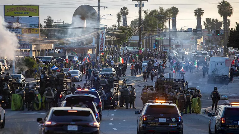 وتابع: “ما تشهدونه في كاليفورنيا هجوم شامل على السلم والنطام العام والسيادة الوطنية، ينفذه مثيرو شغب يرفعون أعلاما أجنبية بهدف مواصلة اجتياح أجنبي لبلدنا”، وفقا لسكاي نيوز.