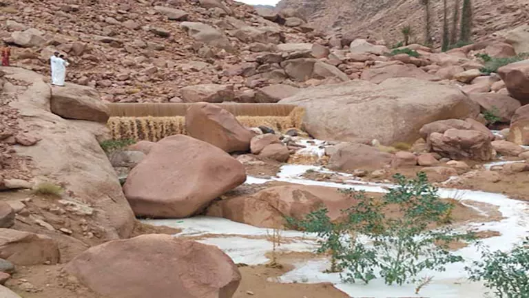 رسمت مياه الأمطار التي تساقطت من أعلى قمم الجبال بمدينة سانت كاترين، عقب تعرضها لتساقط أمطار متوسطة اليوم، لوحة فنية طبيعية بعد تدفق المياه وسط الصخور الجبلية، مندفعة بشدة نحو مجرى السيل.