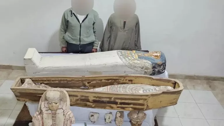 دفعهما الفضول إلى الحفر، ليكتشفا كنزًا مذهلًا: تابوت خشبي كبير، يحمل نقوشًا غريبة، يظهر منه جزء من مومياء ملفوفة بالكتان، وبجواره، وجدا تابوتًا آخر مغلقًا بإحكام، بالإضافة إلى 4 وجوه خشبية، و26 تمثالًا صغيرًا بنقوش فرعونية.