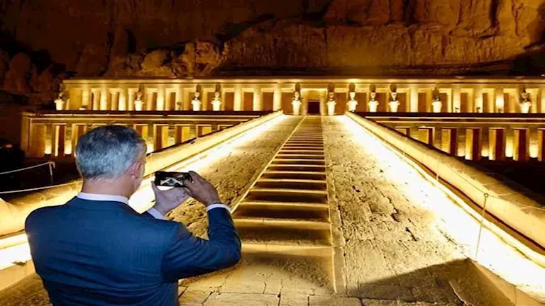 والتقط الملك وقرينته – خلال الزيارة – صور “سيلفي” في قلب معبد الملكة حتشبسوت بالدير البحري، وشهدا الإطلاق التجريبي لمشروع الإضاءة الليلية للمعبد التاريخي في أحضان جبل القرنة، وسط أجواء احتفالية أبهرت الحاضرين.