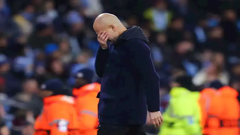 جوارديولا عاد بعد استراحة الشوط الأول وتظهر عليه علامات جروح وتورم في وجهه، وهو ما يصف الحالة النفسية التي يمر بها المدرب المخضرم.