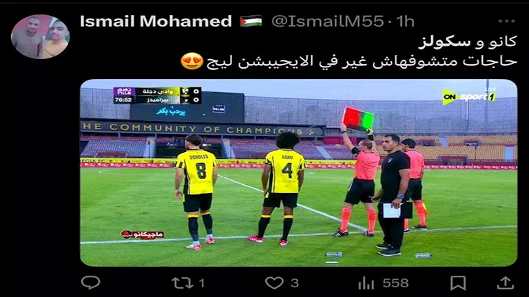 وعلق أحد الرواد على ثنائي محترفي وادي دجلة المشاركين في اللقاء:”مشاهد لا تراها إلا في الدوري المصري، سكولز وكانو يشاركان فى مباراة وادى دجلة وبيراميدز في افتتاح ⁧‫الدوري المصري”.