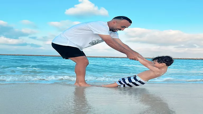 وظهر قفشة في الصور وهو يلعب مع نجله على رمال البحر، وسط أجواء عائلية مرحة.